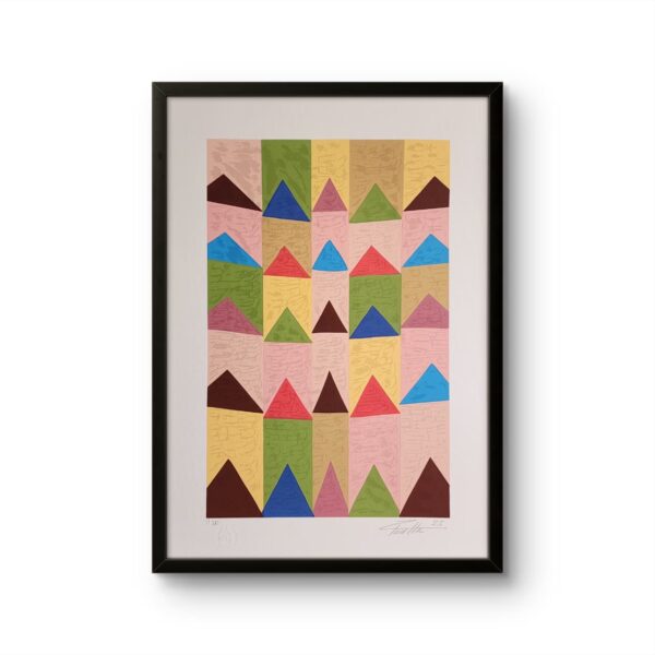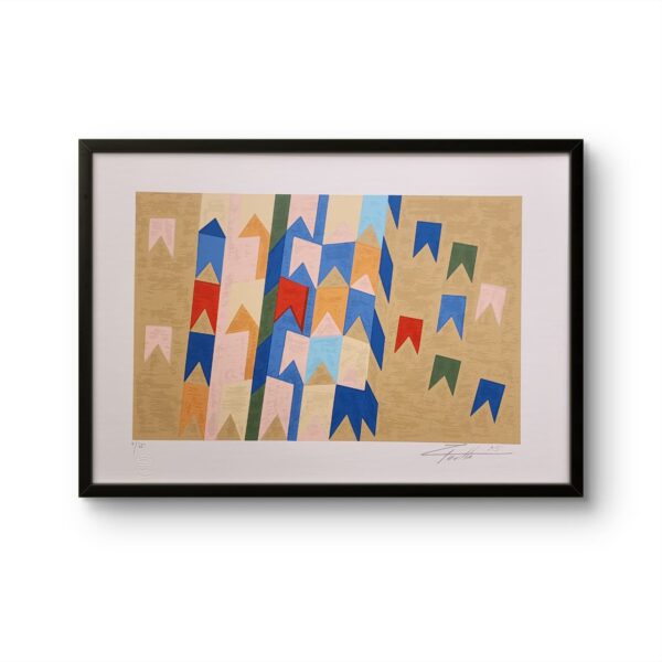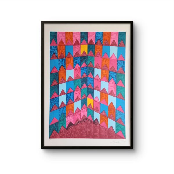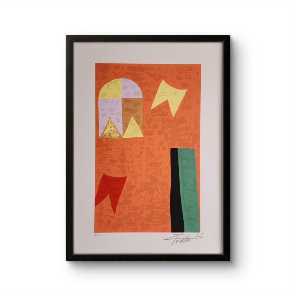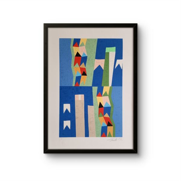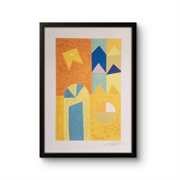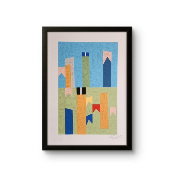 A gravura desenvolve e mantém a mesma pesquisa estética presente nas pinturas, explorando geometria, memórias e relações cromáticas, agora traduzidas no papel com textura e profundidade.