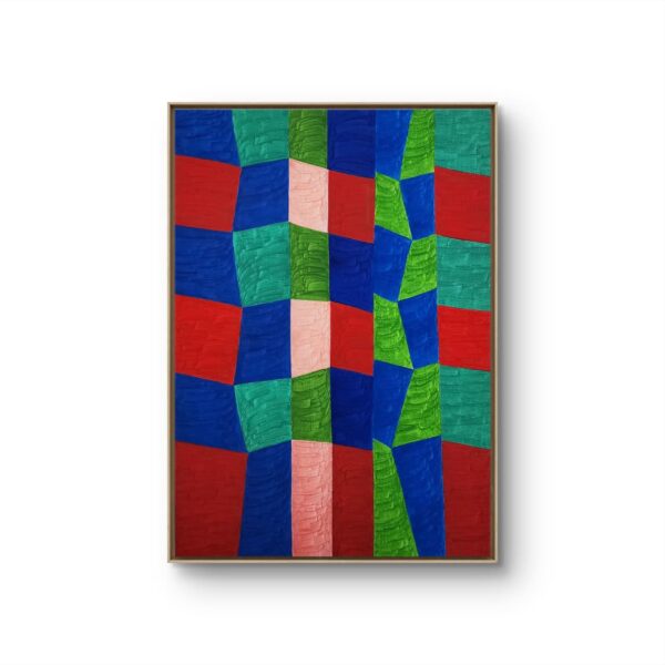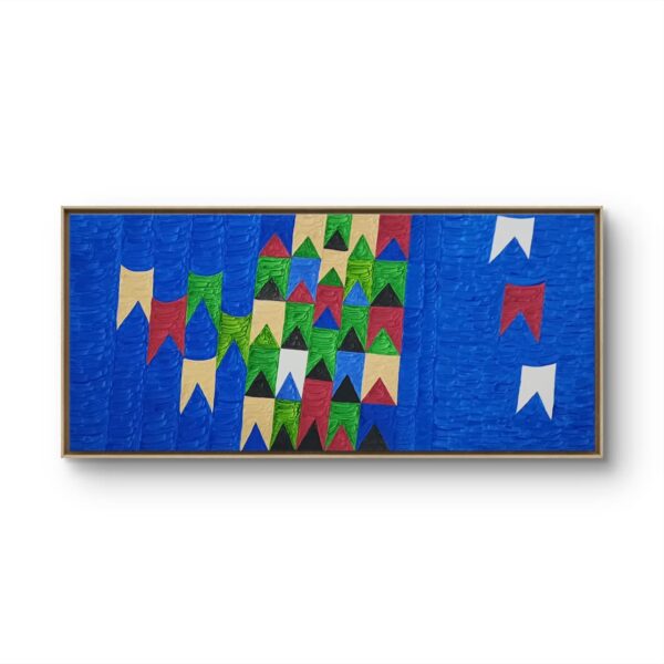 A energia das cores se destaca sem perder a harmonia, criando uma presença que transforma o ambiente e desperta o olhar a cada instante. A técnica da têmpera revela uma textura viva, onde cada sutil pincelada constrói, com delicadeza, o movimento da obra. Em contraste com a profundidade intensa do fundo, a matéria se afirma com elegância, sustentando um equilíbrio marcado pela intensidade e pela presença.