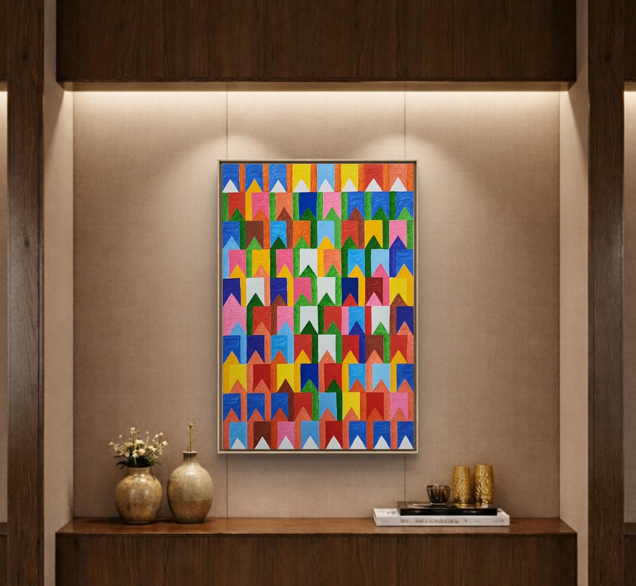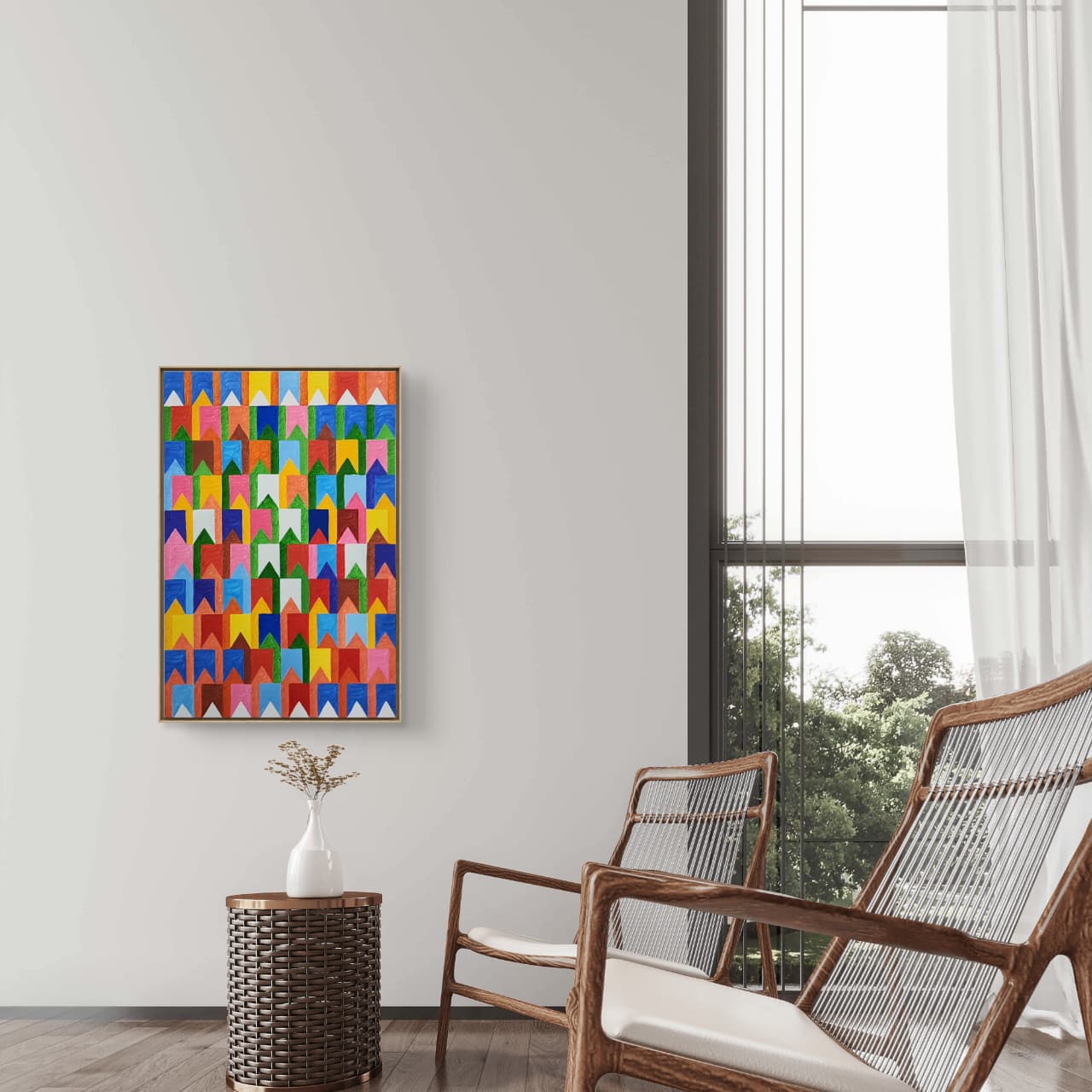 Uma obra que resgata técnicas clássicas com um olhar contemporâneo. Nesta criação exclusiva, Zi Facella utiliza a têmpera sobre tela para explorar formas, cores e texturas que homenageiam a estética modernista brasileira.