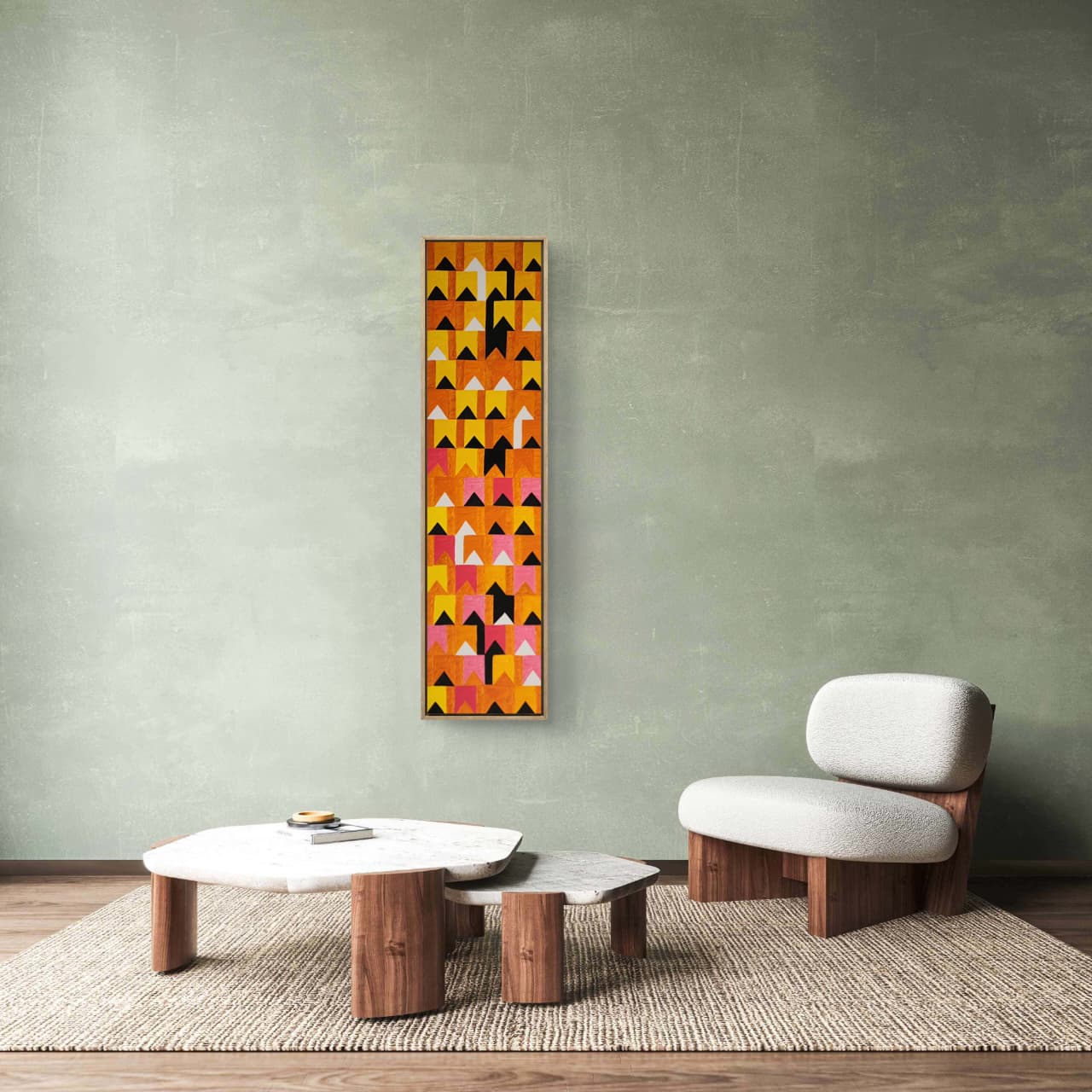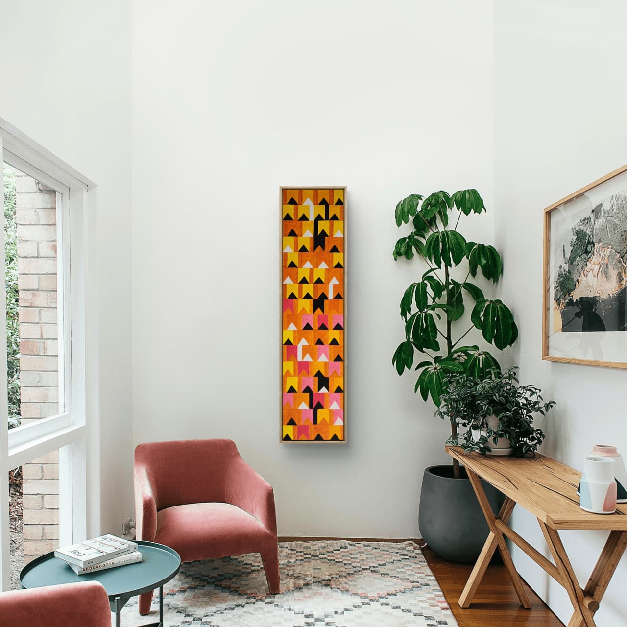 Uma obra que resgata técnicas clássicas com um olhar contemporâneo. Nesta criação exclusiva, Zi Facella utiliza a têmpera sobre tela para explorar formas, cores e texturas que homenageiam a estética modernista brasileira.