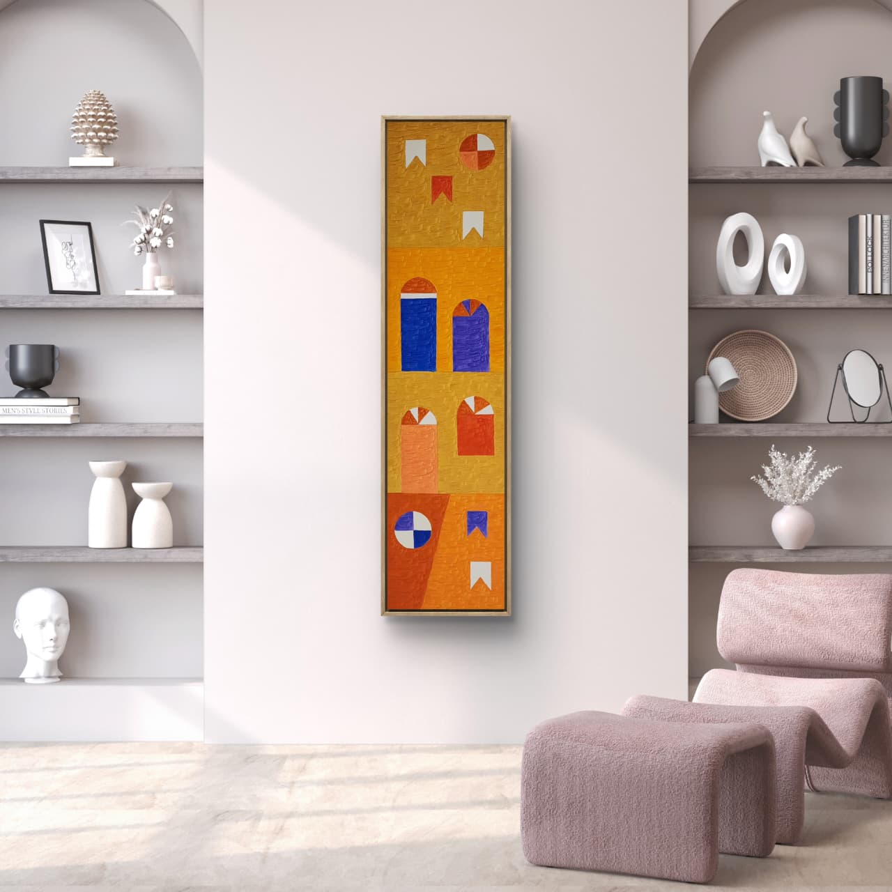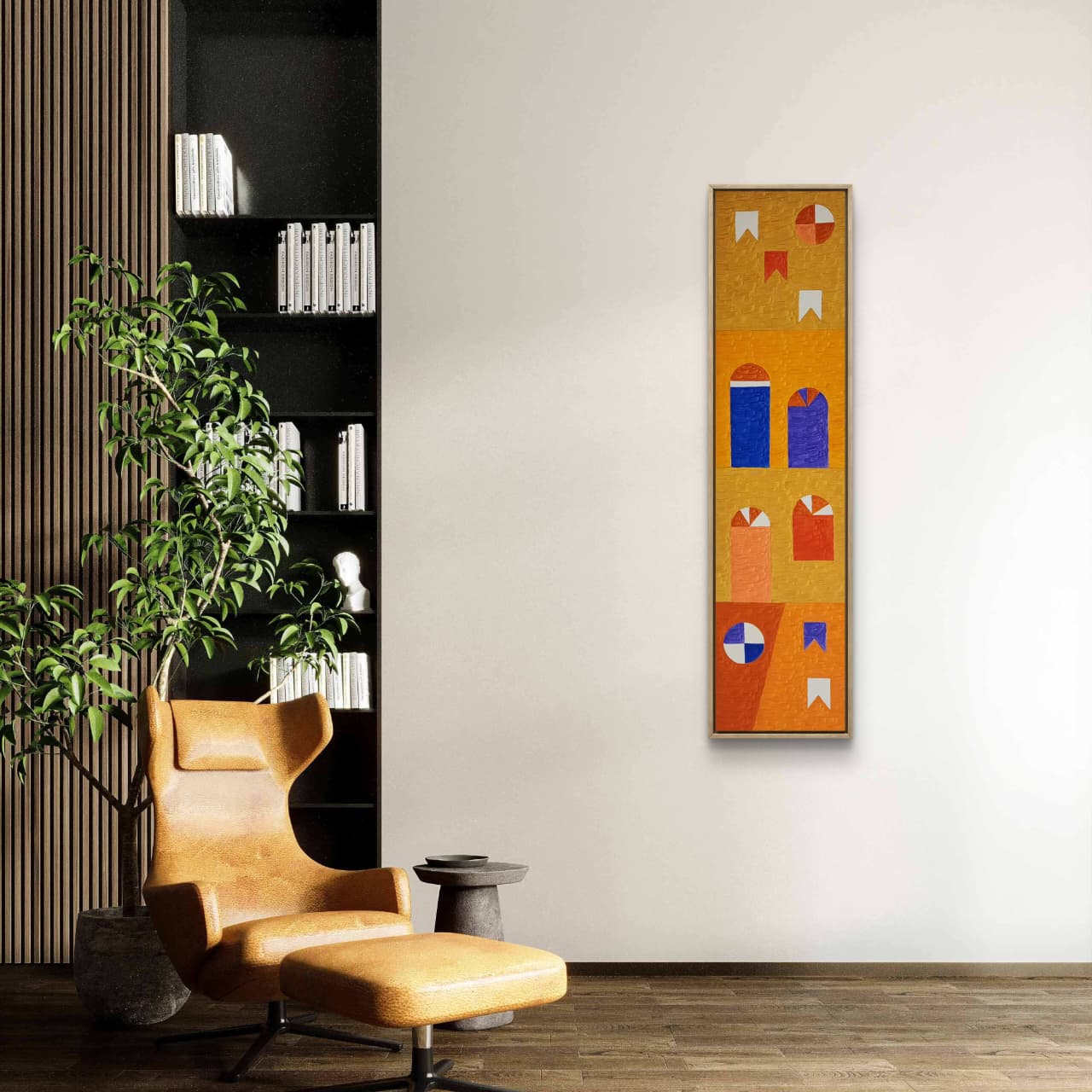 Uma obra que resgata técnicas clássicas com um olhar contemporâneo. Nesta criação exclusiva, Zi Facella utiliza a têmpera sobre tela para explorar formas, cores e texturas que homenageiam a estética modernista brasileira.